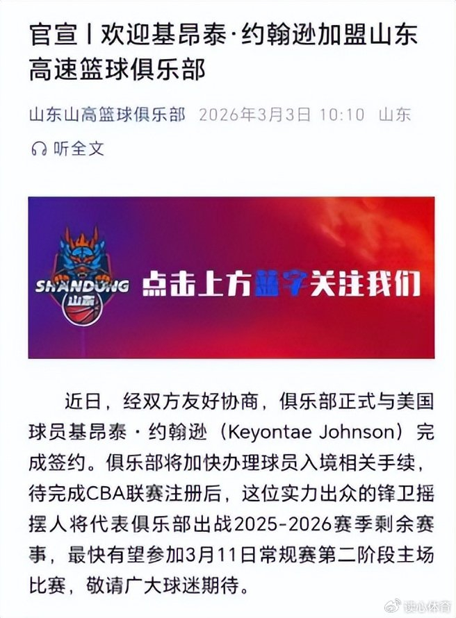 山东高速官宣第4外援基昂泰-约翰逊加盟,约翰逊只有26岁,身高1米95,臂展达到了惊人的2米11,过去三个赛季均在NBA发展联盟效力,不仅能突破制造杀伤,而且外线投射能力也颇有准头,可以在珀塞尔下场休息时承担起球队进攻重任。基昂泰-约翰逊在发展联盟场均能得到接近20分,而且三分命中率长年维持在四成左右,是邱彪指导筛选诸多小外资料后钦点的外援。相较于前两个赛季的引援,不少山东球迷感叹,终于可以不签其他球队用剩下的破烂了,山东高速正为基昂泰-约翰逊办理通关及注册手续,虽然赶不上与广州龙狮的补赛,但第二阶段开打前将肯定能够到位。