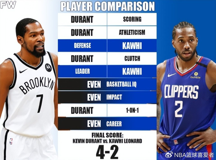 影响力的对比比较主观,无法像数据荣誉那样直接体现。杜兰特则是历史最出色的得分手之一,中锋般的身材却拥有后卫的技术和投射,他打破了人们对于高个子球员只能打内线的认知。也正是因为杜兰特的出现,越来越多的高个球员开始注重技术与投射。伦纳德虽然也是联盟顶级球星之一,但在知名度与人气方面显然不如杜兰特。