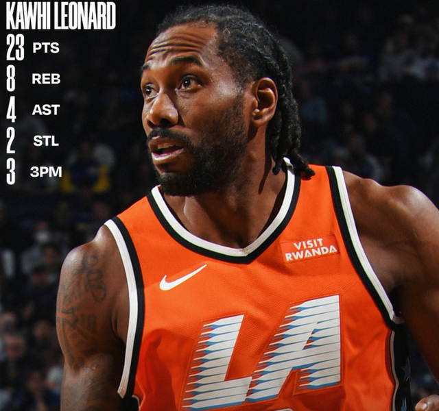今天伦纳德打了29分钟,14投9中,3分球6投3中,拿到了23分8板4助2断。