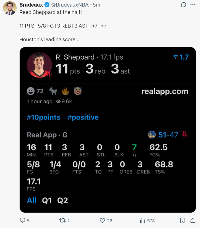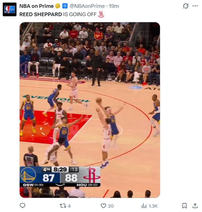 第三节谢泼德5分钟里3中3+三分1中1拿到7分1助攻,他已经是火箭三节打完反超的关键功臣,三节打完已经拿到18分。不过末节他的表现更是引爆主场球迷,他连续三个三分球帮助火箭一度拉开到6分,只可惜他被换下后勇士很快扳平。