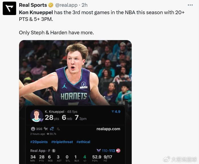 同时本场再次拿到20+得分,并且至少命中5记三分后,克努佩尔成为开季至今交出这一数据第三多的球员,仅次于哈登与库里两名历史级别巨星。