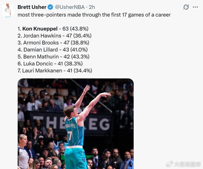 本场命中7记三分后,克努佩尔开季17场比赛已经命中63记三分,成为NBA历史上生涯前17场比赛命中三分数最多的球员。